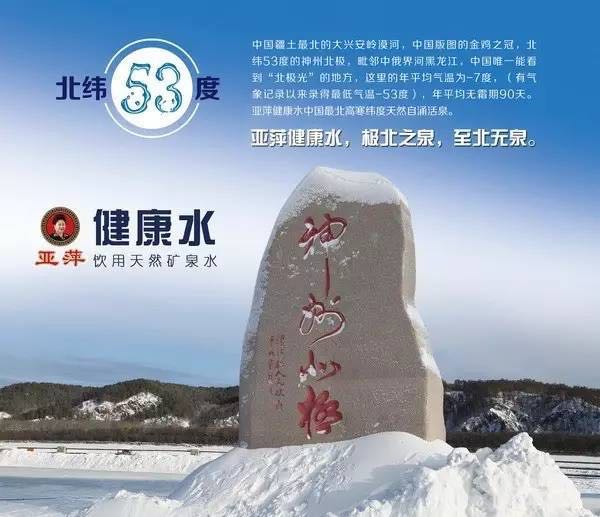 ● 亚萍健康水天然矿泉水,产自中国最北端原始森林深处,冬季最低气温零下60度。根据科学考证,北极泉水源自四百米永久冻土层下,白垩纪火山岩构造缝隙中循环,水龄约1.4亿年。