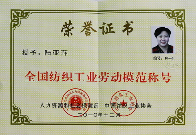 陆亚萍董事长被评为“全国纺织工业劳动模范”