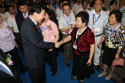 在博览会期间江苏省省长罗志军(左三)、江苏省副省长史和平(左一)、中国纺织工业协会会长杜钰洲(左二)参观亚萍漂亮家纺展厅并与陆亚萍董事长亲切交谈(右图)