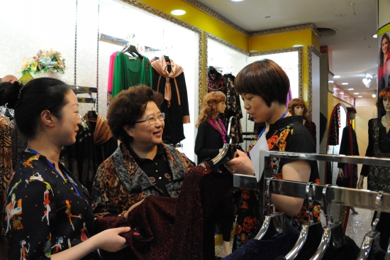 图为陆亚萍(中)在亚萍国际购物广场服装销售柜台向柜长们了解消费者的需求。 本报记者 徐国营 摄