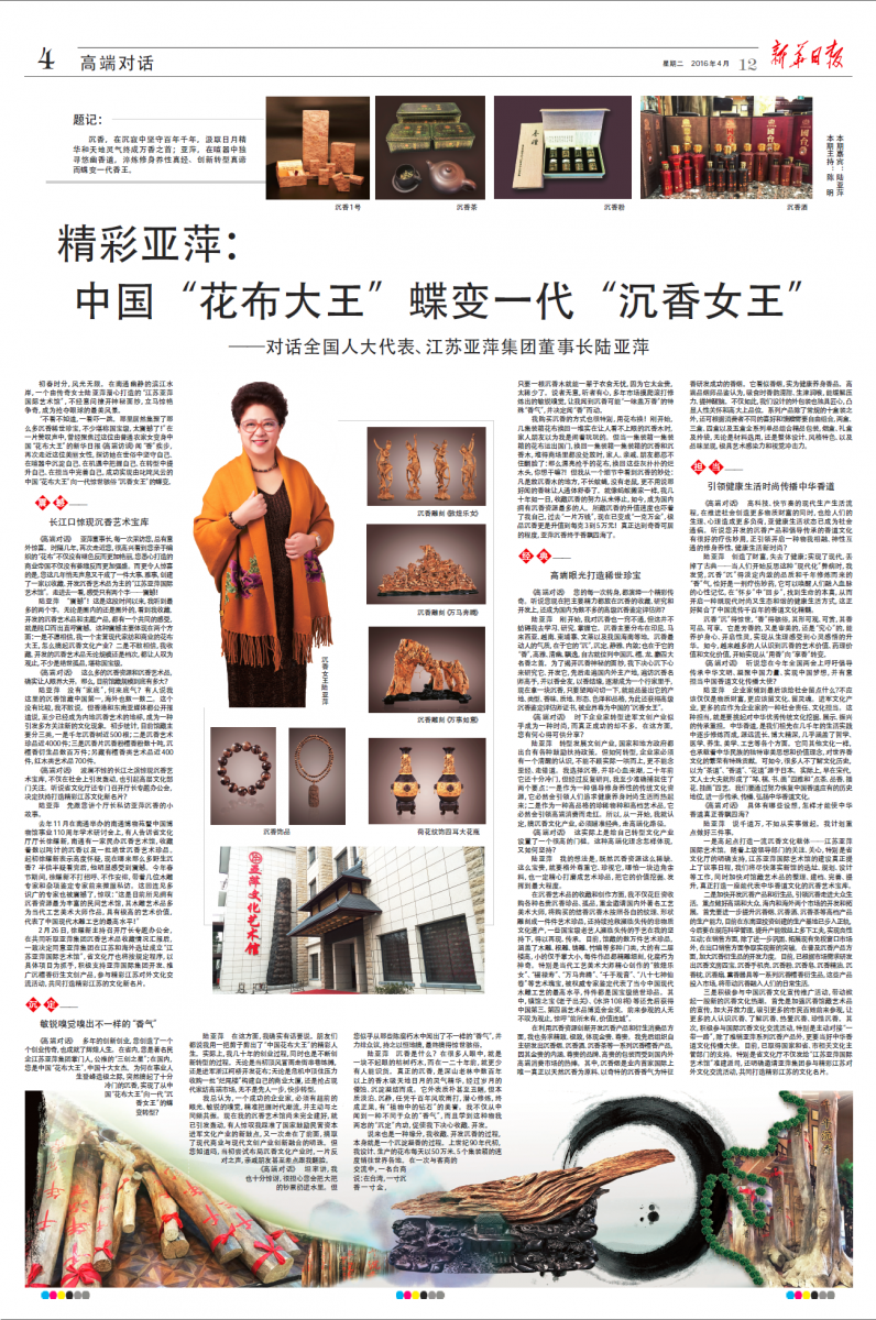 《高端对话》 多年的创新创业,您创造了一个个创业传奇,也成就了辉煌人生。在省内,您是著名民企江苏亚萍集团掌门人,公推的“三创之星”;在国内,您是中国“花布大王”,中国十大女杰。为何在事业人生登峰造极之际,突然搞起了十分冷门的沉香,实现了从中国“花布大王”向一代“沉香女王”的蝶变转型?