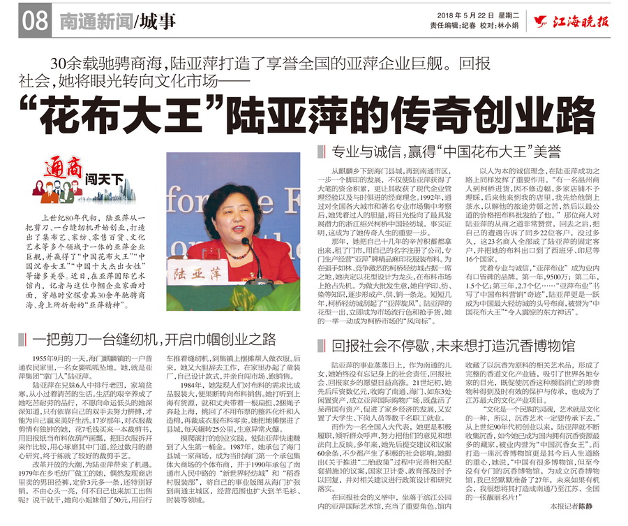 上世纪80年代初,陆亚萍从一把剪刀、一台缝纫机开始创业,打造出了集布艺、家纺、零售百货、文化艺术等多个领域于一体的亚萍企业巨舰,并赢得了“中国花布大王”“中国沉香女王”“中国十大杰出女性”等诸多美誉。近日,在亚萍国际艺术馆内,记者与这位巾帼企业家面对面,穿越时空探索其30余年驰骋商海、身上所折射的“亚萍精神”。