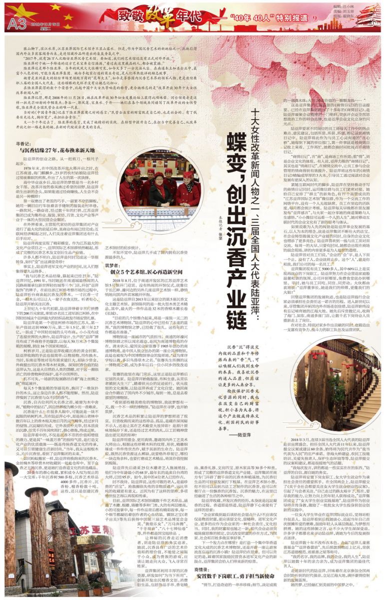 她曾是亚洲最大的轻纺市场里领跑万商的“花布大王”,如今是享誉国内沉香艺术界的领军人物,更是连续履职三届的全国人大代表。这些耀眼的光环并没有让她忘记初心。