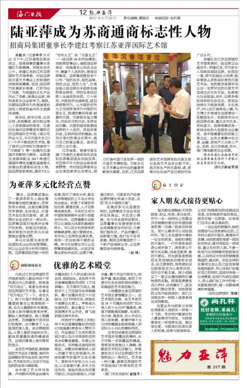 新华社、新华日报、北京日报、浙报集团、深圳报业等二十多家媒体的领导、记者纷纷造访亚萍集团所属的江苏亚萍国际艺术馆。《昔日花布业大王、今日沉香木女王》《一个并不熟悉的艺术馆,看了绝对让你惊叹》《南通有个“万佛堂”》等一批稿件见诸国内有影响力媒体。由南通主流媒体配合2017南通江海国际博览会暨首届通商大会推出的通商标志性人物,陆亚萍居前亮相。题目为《从“花布大王”到“沉香女王”——陆亚萍30年历经蝶变,成就美丽事业》。编前话这样表述:在南通本土知名企业中,最富个人色彩的,便是亚萍集团。亚萍集团曾经有个口号:“我的名字,我的品牌,我的企业,我的人生”,它是创始人陆亚萍白手起家创造的商业奇迹,同时也是陆亚萍人生追求的体现。三十年来,中国经济快速转型,陆亚萍顺势而为,从中国的花布大王华丽转身成为中国的沉香女王。报道的最后写道:她喜欢沉香,沉香吸天地之精华,历经岁月的沉淀,本质淡泊沉静。沉香的结成就像陆亚萍的个人经历,历经改革开放,互联网经济的崛起,在风云变幻的商业态势中,践行自己的商业理念,追求自己的人生价值。