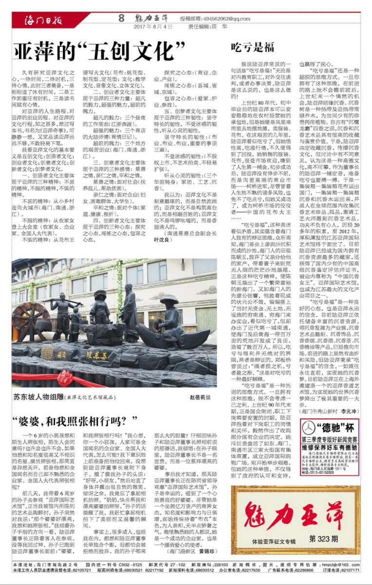 我以为:亚萍文化不是刻意雕琢的,而是自然流淌的;亚萍文化不是构筑高台的,而是相融百姓的;亚萍文化不是鸣锣吆喝的,而是香溢诱人的。