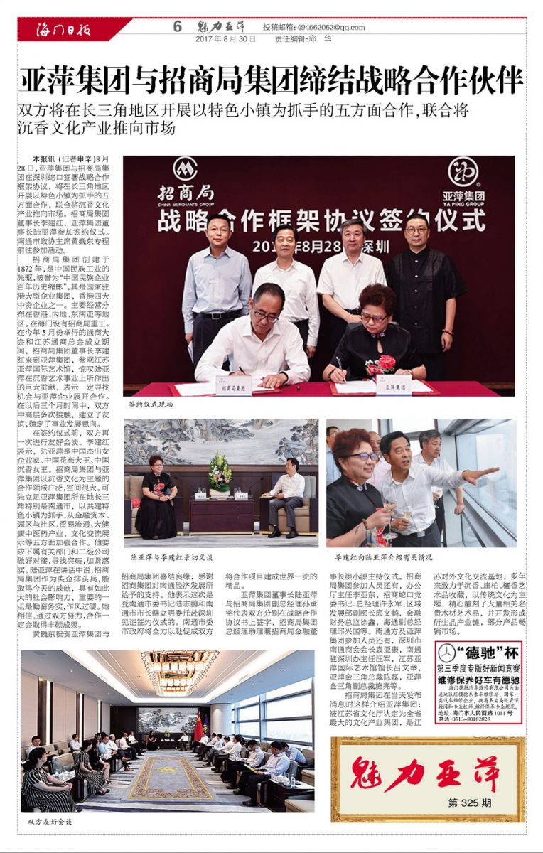 招商局集团创建于1872年,是中国民族工业的先驱,被誉为“中国民族企业百年历史缩影”,其是国家驻港大型企业集团,香港四大中资企业之一。主要经营分布在香港、内地、东南亚等地区。在海门设有招商局重工。在今年5月份举行的通商大会和江苏通商总会成立期间,招商局集团董事长李建红来到亚萍集团,参观江苏亚萍国际艺术馆,惊叹陆亚萍在沉香艺术事业上所作出的巨大贡献,表示一定寻找机会与亚萍企业展开合作。在以后三个月时间中,双方中高层多次接触,建立了友谊,确定了事业发展意向。