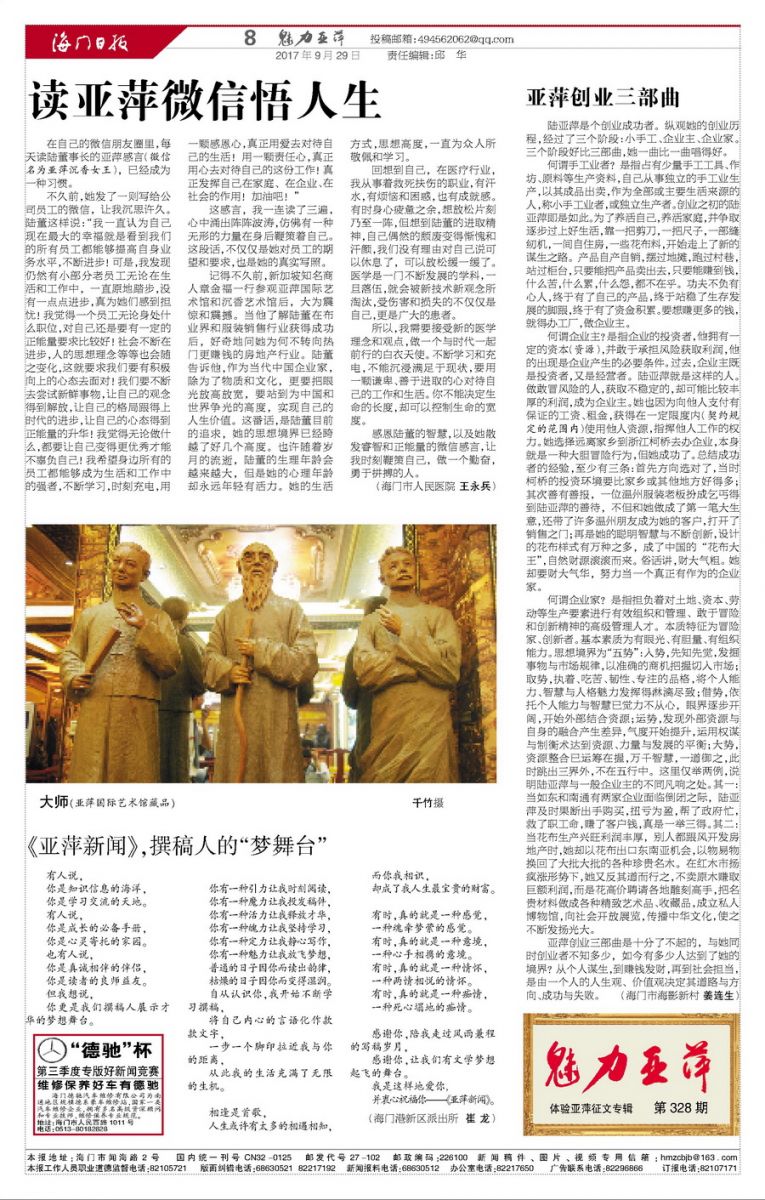 在自己的微信朋友圈里,每天读陆董事长的亚萍感言(微信名为亚萍沉香女王),已经成为一种习惯。