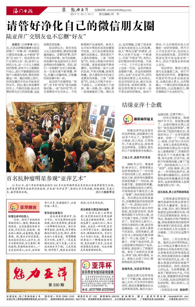 10月10日,海门市抗肿瘤协会组织100多位抗肿瘤明星会员参观江苏亚萍国际艺术馆。亚萍集团董事长陆亚萍热情接待,并共话“长命百岁”,鼓励大家不畏病魔、积极调理、笑看人生,赢得健康体魄。通讯员赵宏军摄