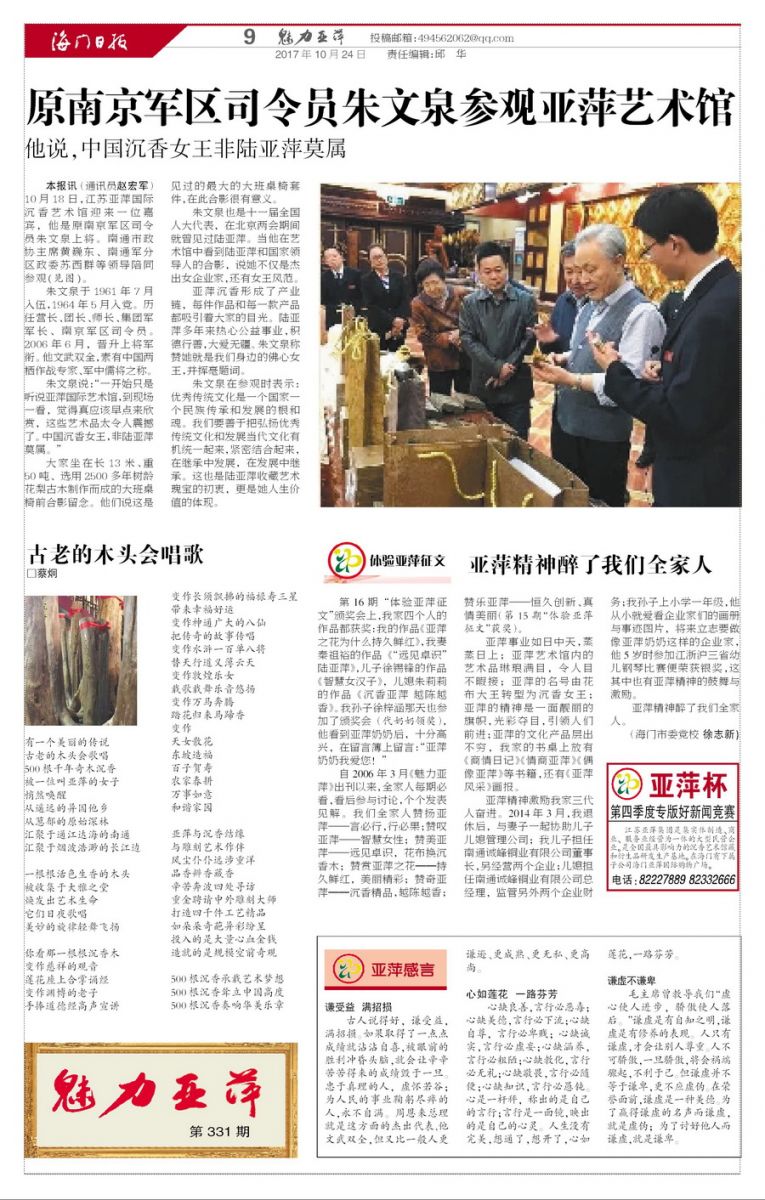 本报讯 (通讯员赵宏军)10月18日,江苏亚萍国际沉香艺术馆迎来一位嘉宾,他是原南京军区司令员朱文泉上将。南通市政协主席黄巍东、南通军分区政委苏西群等领导陪同参观(见图)。