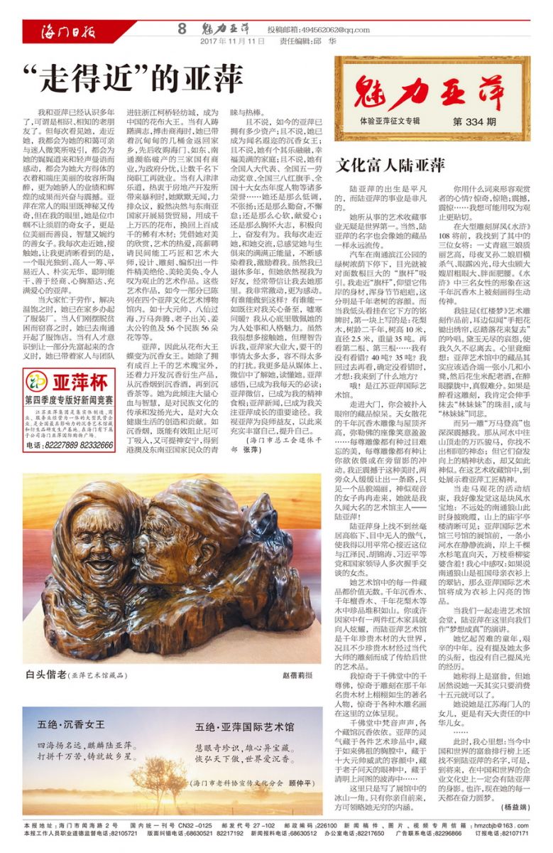 且不说,如今的亚萍已拥有多少资产;且不说,她已成为闻名遐迩的沉香女王;且不说,她有个其乐融融,幸福美满的家庭;且不说,她有全国人大代表、全国五一劳动奖章、全国三八红旗手、全国十大女杰年度人物等诸多荣誉……她还是那么低调,不张扬;还是那么勤奋,不懈怠;还是那么心软,献爱心;还是那么胸怀大志,积极向上,奋发有为。我每次走近她,和她交流,总感觉她与生俱来的满满正能量,不断感染着我,激励着我。虽然我已退休多年,但她依然视我为好友,经常带信让我去她那里。我非常激动,更为感动。有谁能做到这样?有谁能一如既往对我关心备至,嘘寒问暖?我从心底里敬佩她的为人处事和人格魅力。虽然我很想多接触她,但理智告诉我,亚萍家大业大,要干的事情太多太多,容不得太多的打扰。我更多是从媒体上、微信中了解她,读懂她。亚萍感悟,已成为我每天的必读;亚萍微信,已成为我的精神食粮;亚萍新闻,已成为我关注亚萍成长的重要途径。我视亚萍为良师益友,以此来充实丰富自己,提升自己。