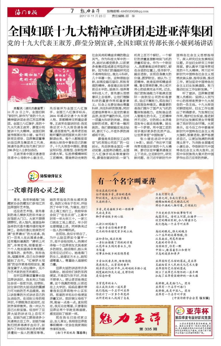 本报讯 (通讯员赵宏军)11月21日上午,全国妇联“新时代、新作为”党的十九大精神宣讲团走进江苏亚萍集团。全国三八红旗手、党的十九大代表王淑芳、薛莹分别宣讲十九大精神。全国妇联宣传部部长张小媛、省市妇联有关领导、亚萍集团董事长陆亚萍及集团员工代表、南通市各界女性代表们共计200多位人士参加活动。
