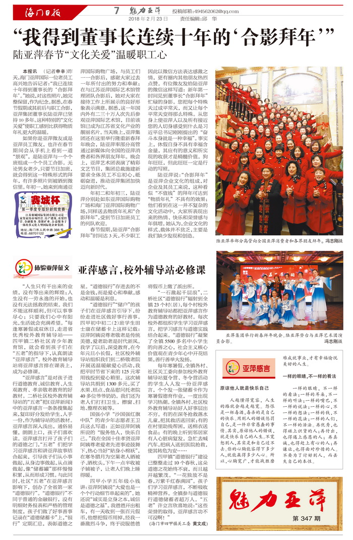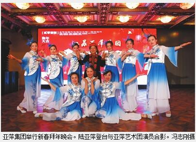 如果你是亚萍微友或是亚萍员工微友,也许在春节期间会从手机上看到一道“景观”,是陆亚萍与一个个班组或一个个员工合影。无论男女老少,只要节日加班,就会得到这一特殊形式的拜年,有许多照片则被晒到微信里。年初一,她来到南通亚萍国际购物广场,与员工们一一合影后,感谢大家过去一年所付出的努力和奉献;在与江苏亚萍国际艺术馆管理团队合影后,她对大家在接待工作上所展示的良好形象表示满意。据悉,这一年国内外有二三十万人次先后参观亚萍国际艺术馆,目前该馆已成为江苏省文化产业的靓丽名片。当天晚上,亚萍集团还在这里举行隆重新春拜年晚会,陆亚萍率部分高管通过新媒体向全国的亚萍消费者和各界朋友拜年。晚会上,亚萍艺术团表演了精彩文艺节目,集团总裁施建新要求全体员工不忘初心,砥砺奋进,推动亚萍集团加快迈向新时代。
