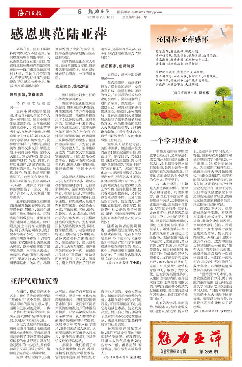 随着被访者的娓娓讲述,感恩典范陆亚萍的高大形象犹在眼前。笔者不由想起亚萍10年前所写《感恩论》中的话:“如果你不懂得感恩于现在所拥有的,那么,这个世界就很难再慷慨地给你更多。”说得多么鞭辟入里,怎不令人叹服!