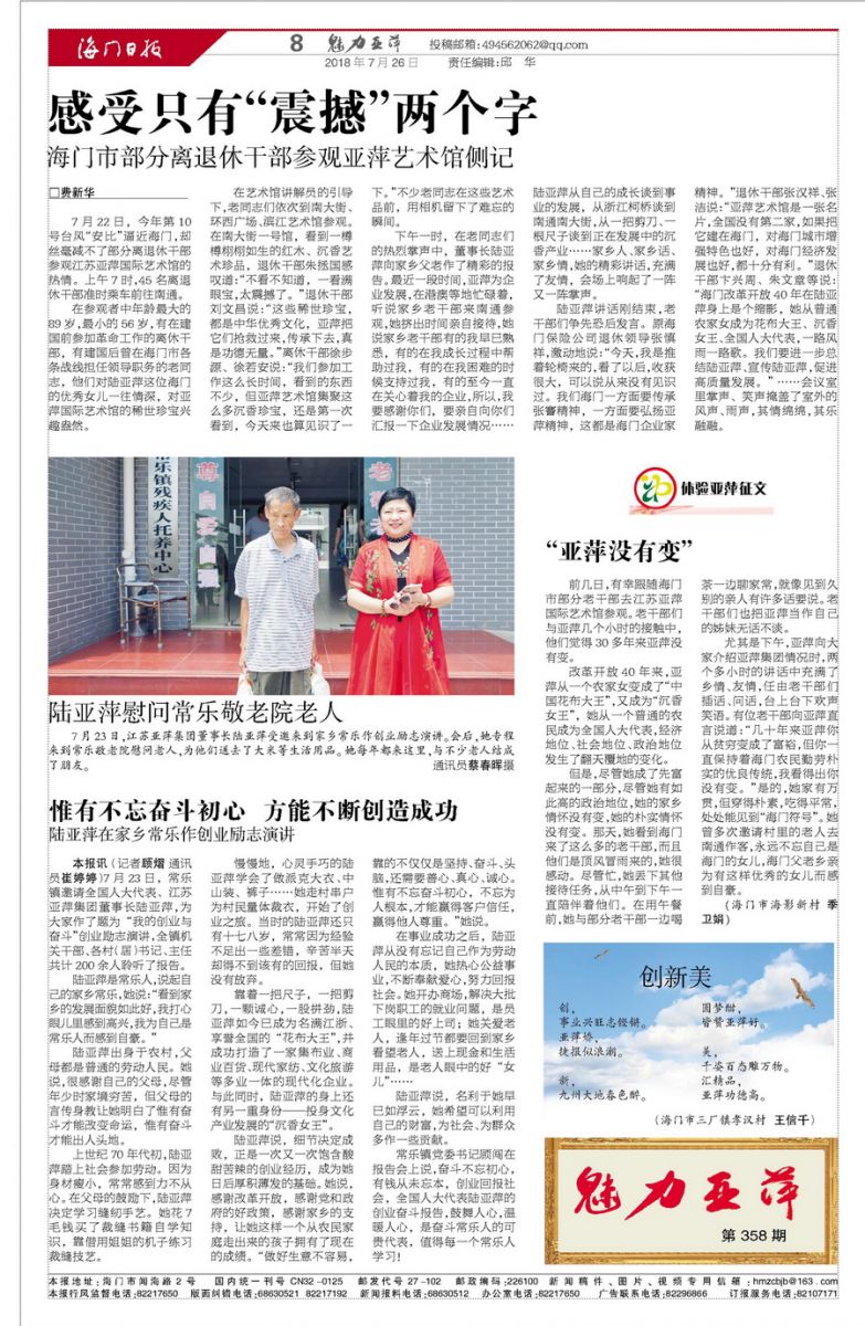 在参观者中年龄最大的89岁,最小的56岁,有在建国前参加革命工作的离休干部,有建国后曾在海门市各条战线担任领导职务的老同志,他们对陆亚萍这位海门的优秀女儿一往情深,对亚萍国际艺术馆的稀世珍宝兴趣盎然。