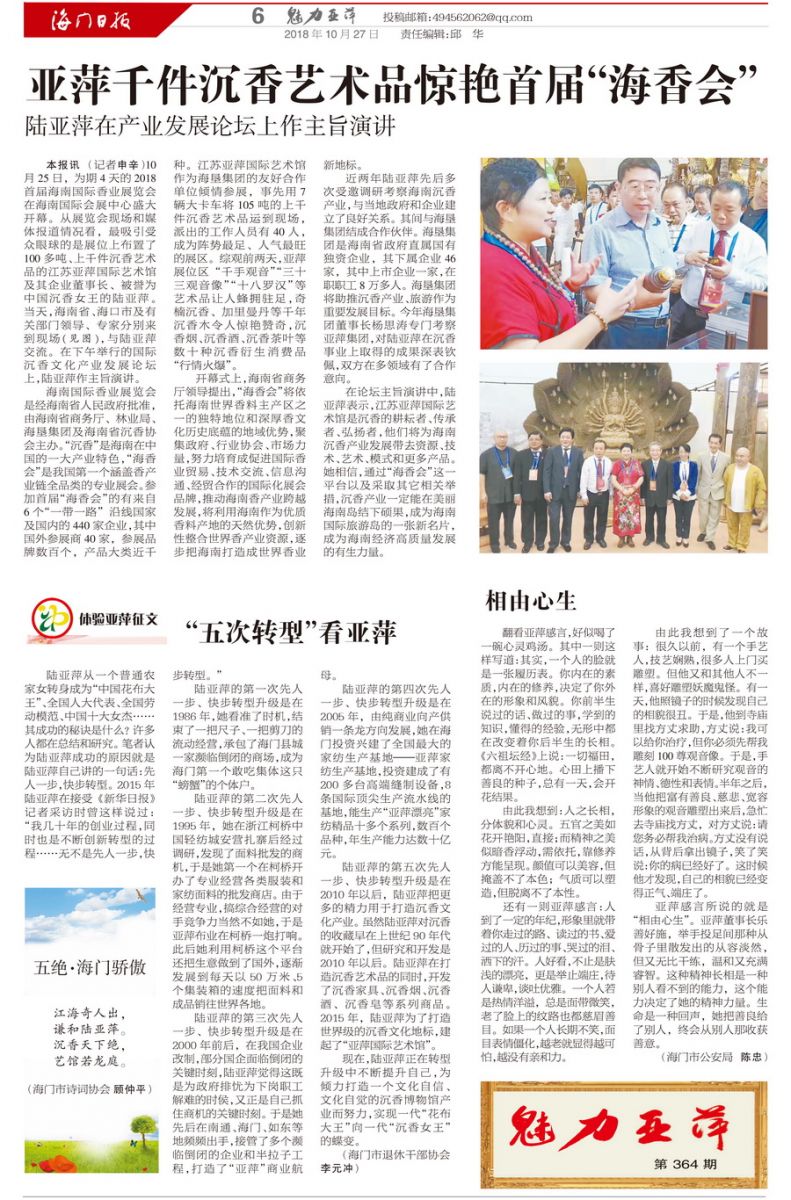 现在,陆亚萍正在转型升级中不断提升自己,为倾力打造一个文化自信、文化自觉的沉香博物馆产业而努力,实现一代“花布大王”向一代“沉香女王”的蝶变。