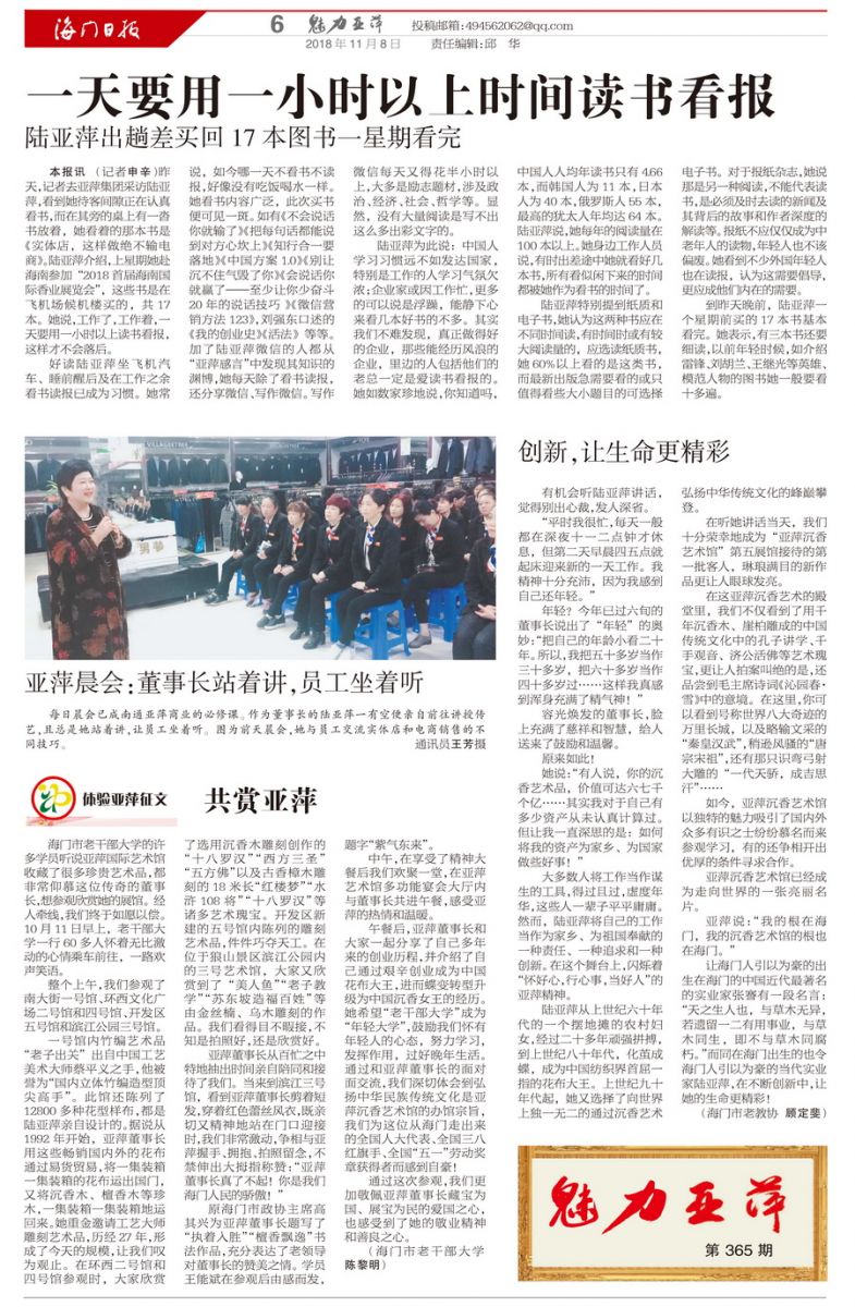本报讯 (记者申辛)昨天,记者去亚萍集团采访陆亚萍,看到她待客间隙正在认真看书,而在其旁的桌上有一沓书放着,她看着的那本书是《实体店,这样做绝不输电商》。陆亚萍介绍,上星期她赴海南参加“2018首届海南国际香业展览会”,这些书是在飞机场候机楼买的,共17本。她说,工作了,工作着,一天要用一小时以上读书看报,这样才不会落后。