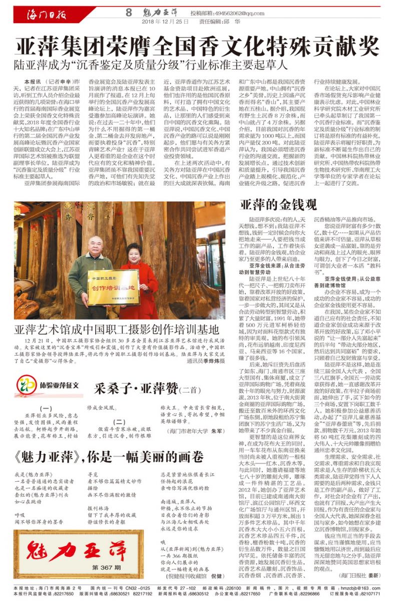 <p style="margin: 0px; padding: 0px; max-width: 100%; clear: both; min-height: 1em; color: rgb(51, 51, 51); font-family: -apple-system-font, BlinkMacSystemFont, " helvetica="" neue",="" "pingfang="" sc",="" "hiragino="" sans="" gb",="" "microsoft="" yahei="" ui",="" yahei",="" arial,="" sans-serif;="" font-size:="" 17px;="" font-variant-numeric:="" normal;="" font-variant-east-asian:="" letter-spacing:="" 0.544px;="" line-height:="" 27.2px;="" widows:="" 1;="" text-indent:="" 2em;="" background-color:="" rgb(255,="" 255,="" 255);="" box-sizing:="" border-box="" !important;="" word-wrap:="" break-word="" !important;"="">本报讯 (记者申辛)昨天,记者在江苏亚萍集团采访,听到工作人员介绍企业最近获得的几项荣誉:在海口举行的首届海南国际香业展览会上荣获全国香文化特殊贡献奖,2018年度全国香行业十大知名品牌;在广东中山举行的第二届全国沉香产业发展高峰论坛暨沉香产业国家创新联盟成立大会上,江苏亚萍国际艺术馆被推选为联盟副理事长单位,陆亚萍成为“沉香鉴定及质量分级”行业标准主要起草人。