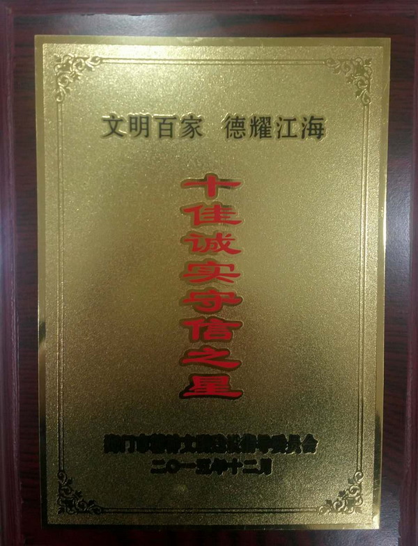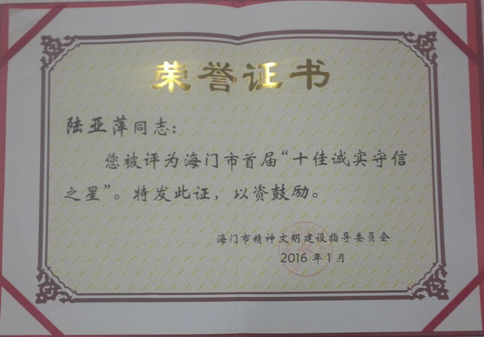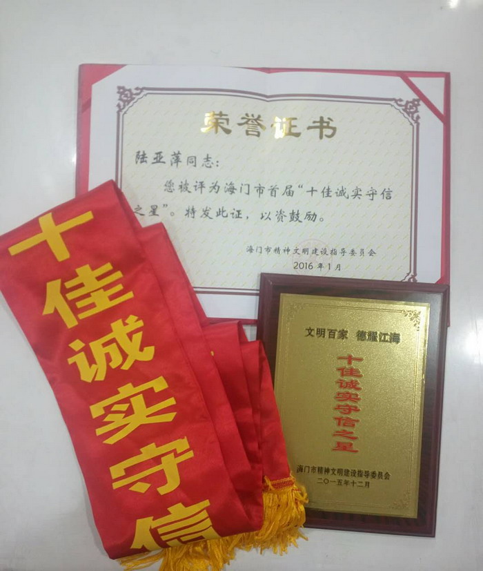 陆亚萍获海门市首届“十佳诚实守信之星”
